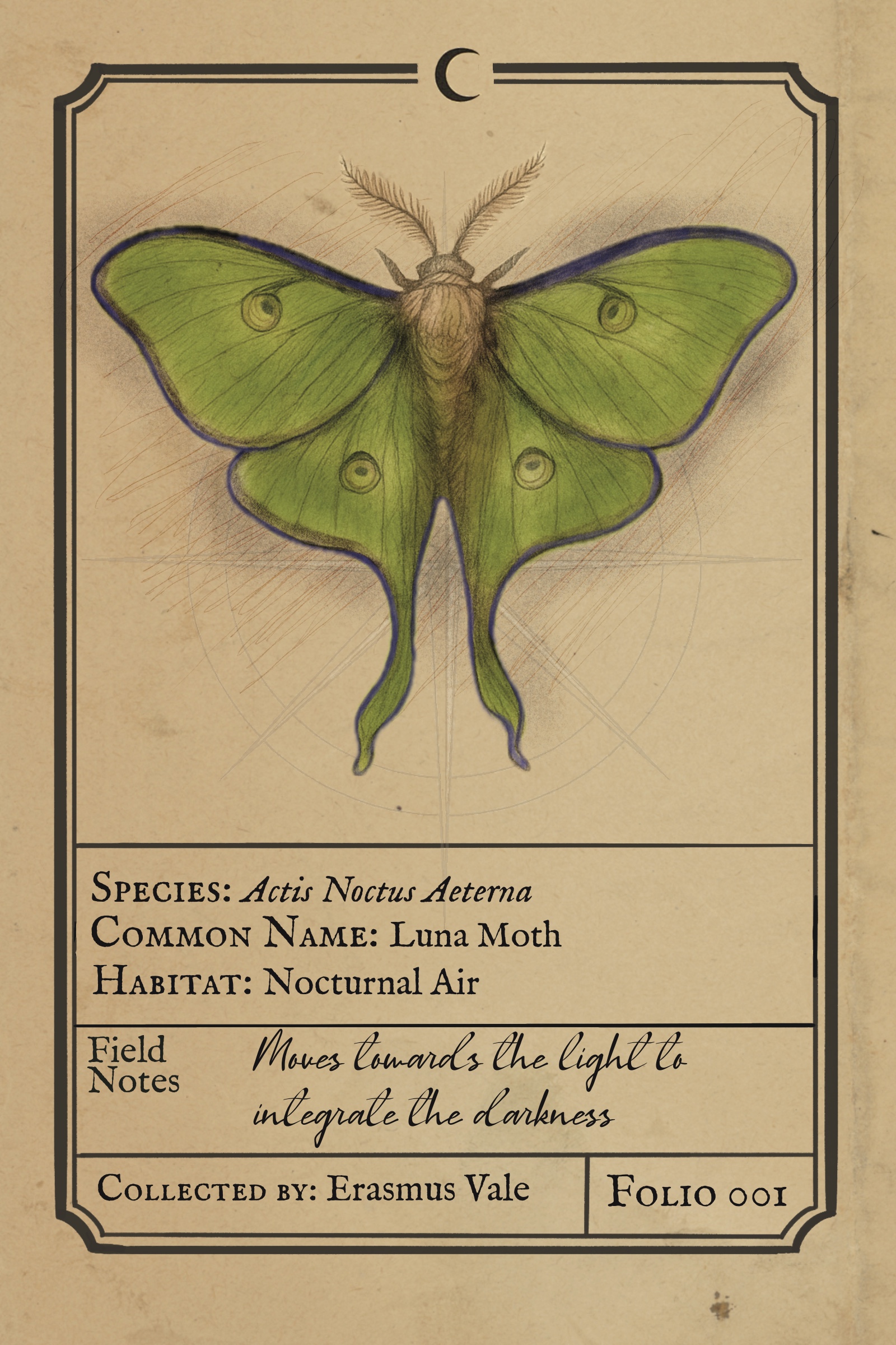 At the crossroads of art, mysticism, and natural philosophy lies The Lost Grimoire of Erasmus Vale. Inspired by the journals of a seventeenth-century anatomist-mystic, this 48-card oracle deck invites you to step into Vale’s world — a place where science and spirit were not at odds, but in conversation. Each card is drawn in the style of an old specimen plate, its imagery illuminated by forgotten symbols and quiet revelations. The companion volume, Field Notes of Erasmus Vale, expands the mythology with observations, meditations, and fragments from the Grimoire itself. Together, they form a complete system of reflection — a cabinet of curiosities for the inner cosmos.